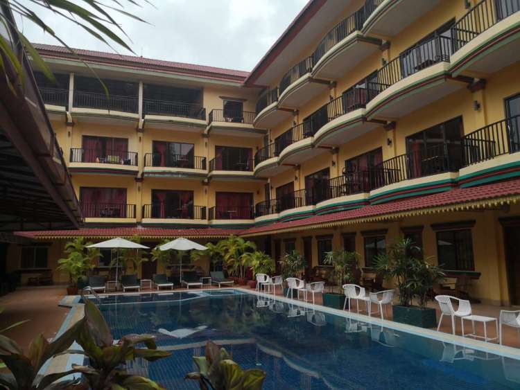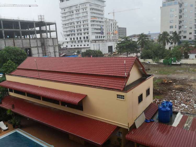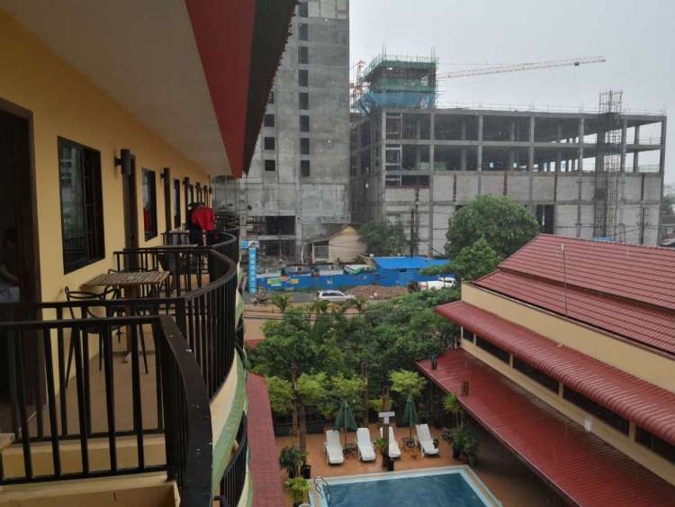 我第一次过来住的西哈努克大酒店就在白沙皇宫对面,三层的小楼环绕着游泳池,门口有非常东南亚花园式的进口,很多植物,隐秘性很好。但是门口就是泥潭,简直进不去。我看用不了多久,房东抵御不了中国人炒房炒地的价格会改行的。结果,五天前从门口路过,宾馆已经拆的只剩下框架了。什么梦想都经不起超乎想象价格的诱惑。