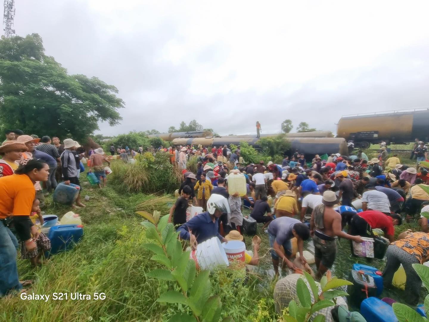 火车脱轨燃油泄漏,村民提桶收集,现场视频曝光