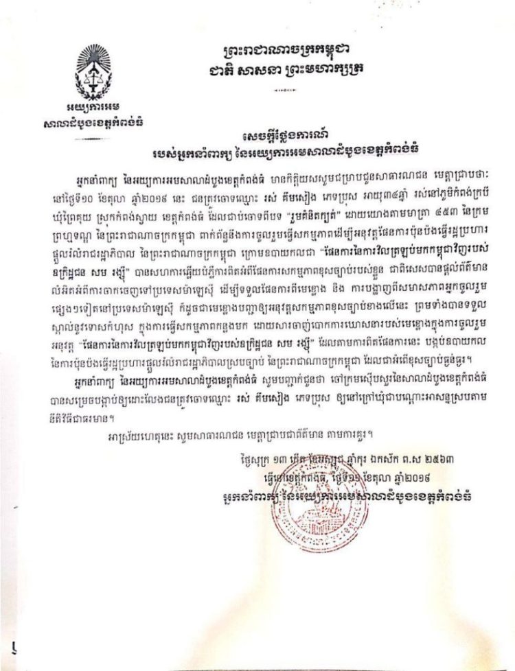 金边初级法院发言人同日发布的新闻通告称,成素坤女士被指控今年9月26日涉嫌违法,串谋从事指导和煽动民众参加沈良西的回国运动。