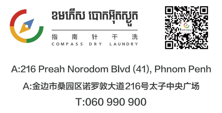 指南针干洗为指南针集团旗下其中一连锁事业体,专做高端洗衣鞋包和公司行号与酒店团体洗涤,总部办公室设在金边271路商业大楼,旗舰示范店在金边诺罗登大道的太子中央广场,预计之后将在暹粒西港开设旗舰分店。