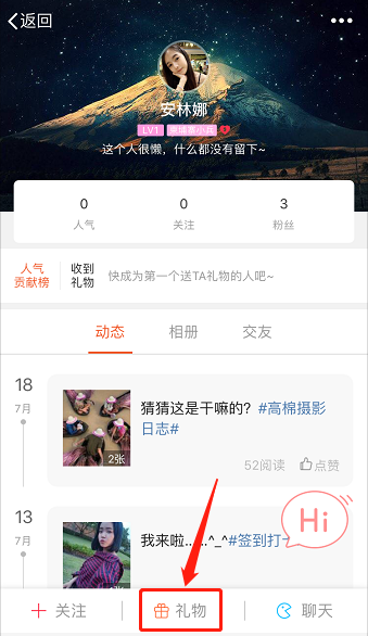 进入用户头像进入其主页,点击下方“礼物”