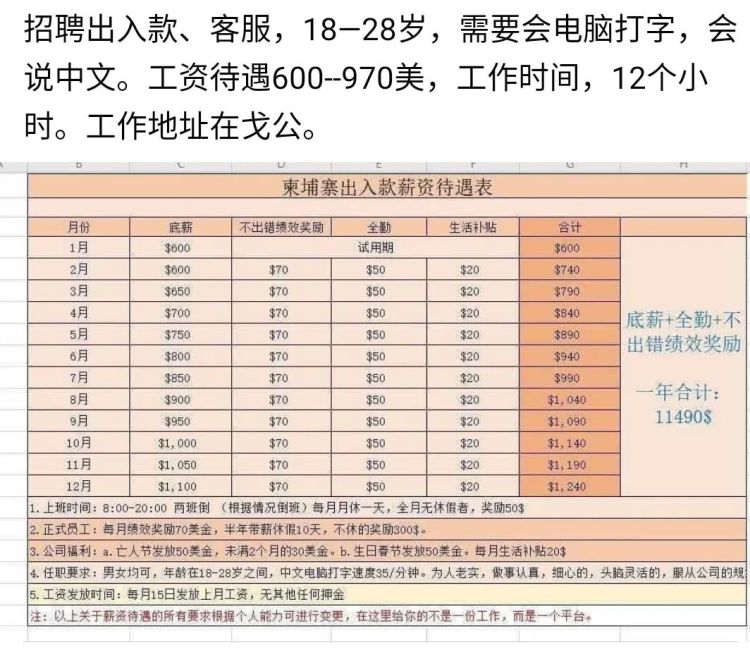 代表博彩公司招聘的人事,在脸书上活动尤为频繁,还有招聘会中文的柬埔寨华人,职位美其名曰客户管理,用微信和客户保持联系,销售商品提供服务。 记者曾经采访过一位在博彩公司工作过的柬埔寨华人,她表示自己当时应聘的岗位是中文客服,当时她刚在中国留学毕业回来,人事给她开了800美金的月薪,因为不了解实情,她就去了。 上班后她发现,她的工作就是管理多个微信,和客户聊天,让他们赌钱。每天上班12个小时,还经常被骂。一个月后,熬不过良心的谴责她辞职了。 她表示,公司里面像她一样会中文的柬埔寨人很多,有些已经工作了2年以上,每个月能拿到1500美金的薪水,生活过得非常不错。