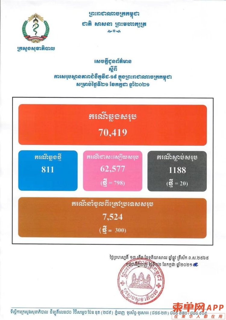 柬埔寨新增105例确诊,104例为社区传播病例