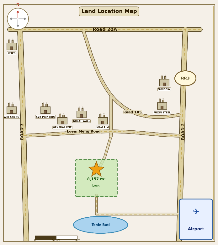 這塊 8,157 平方米 的土地,位於金邊南部發展帶,距離 德崇國際機場約 14–15 公里,同時連接 第三環狀線、國道2號、國道3號、105路、20A路,往下也可通往 Tonle Bati。