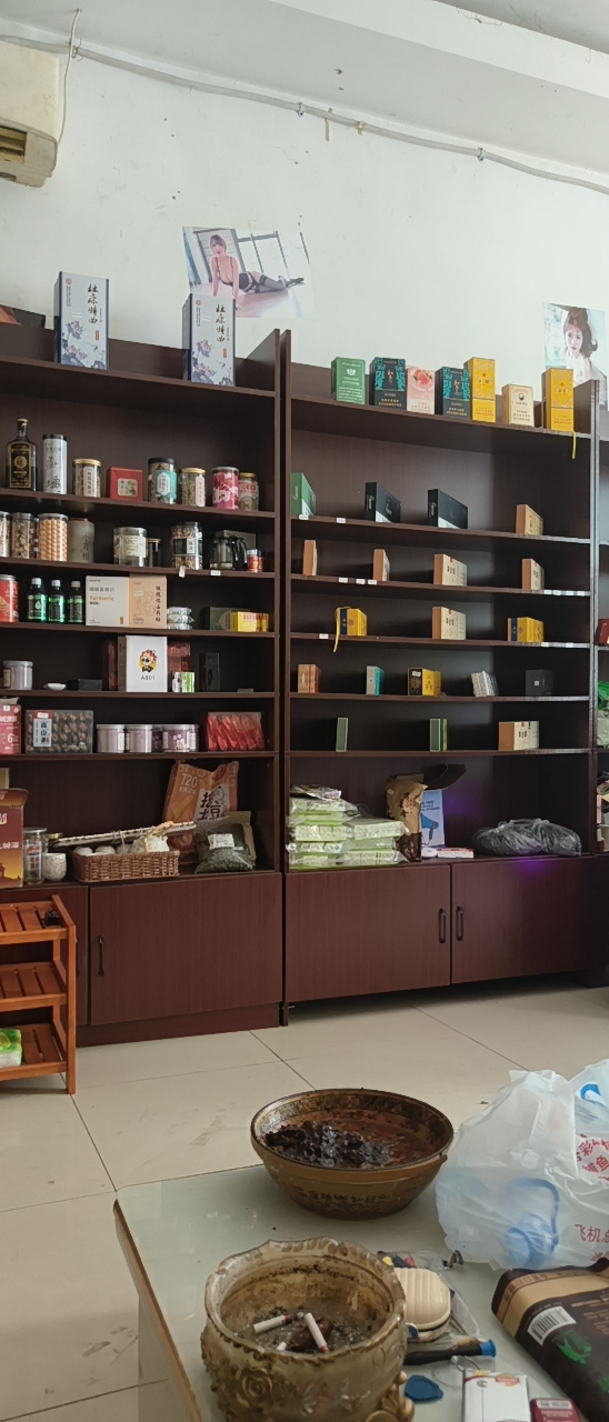货架结实,有4个,可以摆放茶烟酒