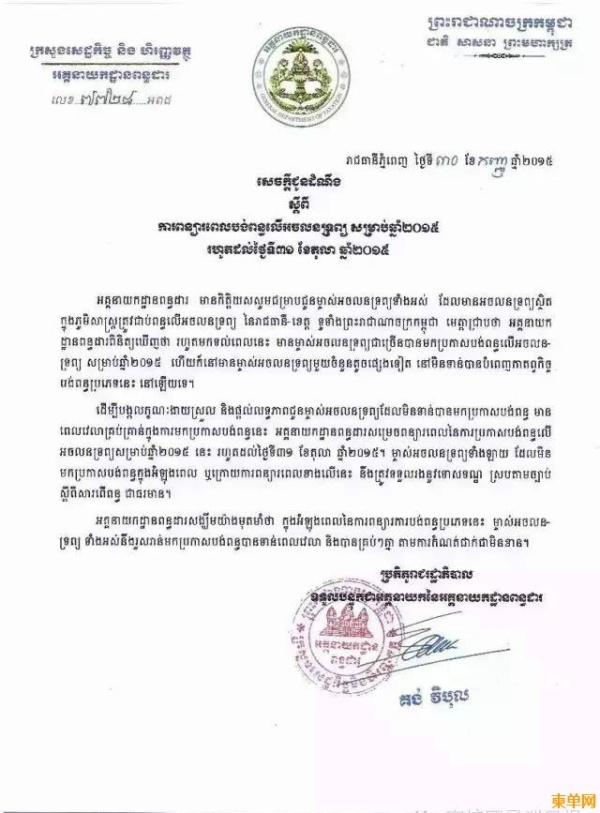 柬埔寨税务总局发表文告,宣布延长产业税的缴付期限。 文告指出,虽然大部份不动产业主已如期纳税,惟仍有一部份业主尚未行动,因此该局决定把原定于9月30日缴税期限 宽延一个月,延长至10月31日,以让屋主有足够时间履行纳税义务。