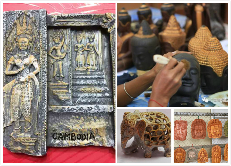 作为一种传统的手工艺品,柬埔寨木雕大多采用质地坚硬、花纹细密的乌木、柚木等木料雕刻而成。其形态各异,神态生动,花纹精细。如今,部分柬埔寨木雕已具有极高欣赏和收藏价值。 名贵木雕的木材有沉香木、黑檀、紫檀、黄花梨和铁木。而红木雕刻成品价值不菲,被喻为“植物中的钻石”,其淡雅宜人的香气至今无法人工合成,因而备受收藏家们的喜爱。