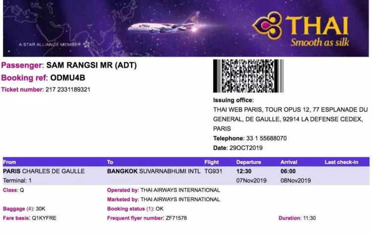 据沈良西在脸书发布的机票信息显示,他将于11月7号12:30分乘坐TG931航班,从法国巴黎戴高乐机场出境,11月8日早上6点抵达泰国曼谷机场,并做好准备于11月9日入境柬埔寨。