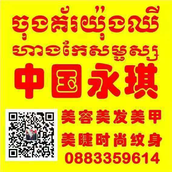 柬埔寨金边永琪美发纹身。春节期间正常营业。不回国的中国老乡可以我这边,洗剪吹一律八折。烫发,染发,护发一律七折。。时尚接发,时尚纹身。想要纹身的提前一天预约。美丽热线0883359614。祝中国老乡新年快乐,万事如意,身体健康。一帆风顺,财源滚滚。地址金边莫尼湾大道197号。