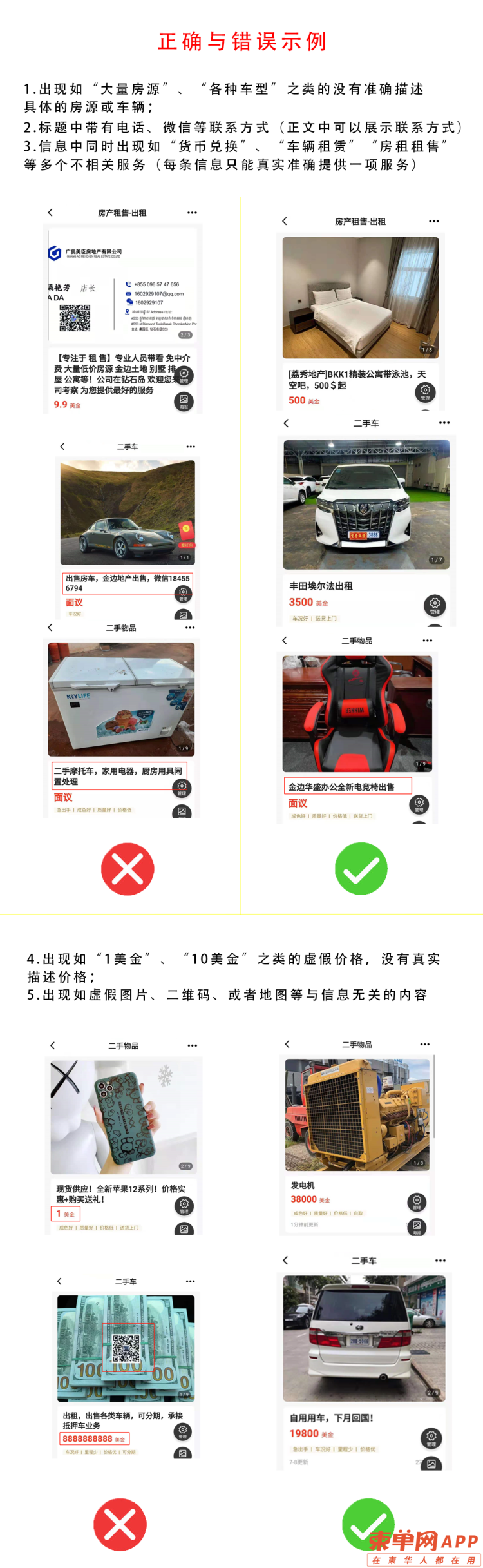 5.   信息中同时出现如“货币兑换”、“车辆租赁”、“房租租售”等多个不相关服务(每条信息只能真实准确提供一项服务)