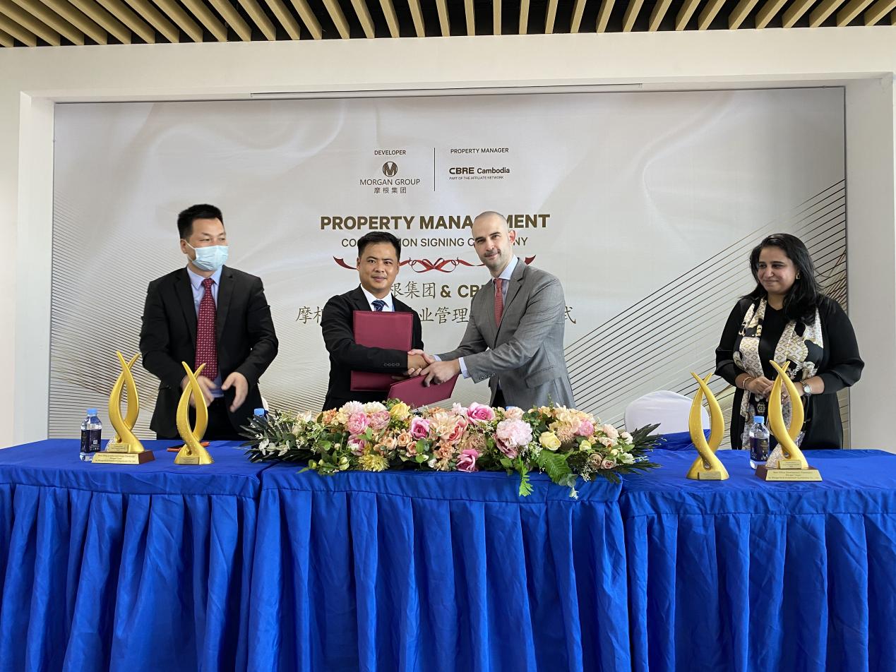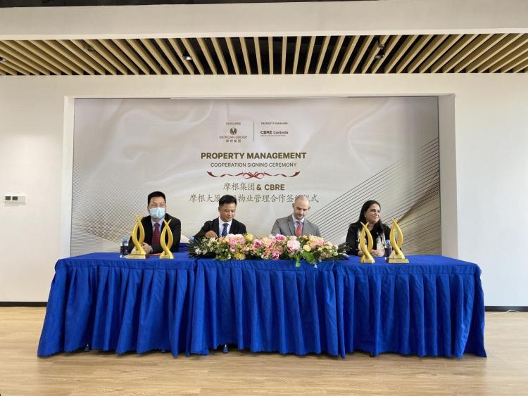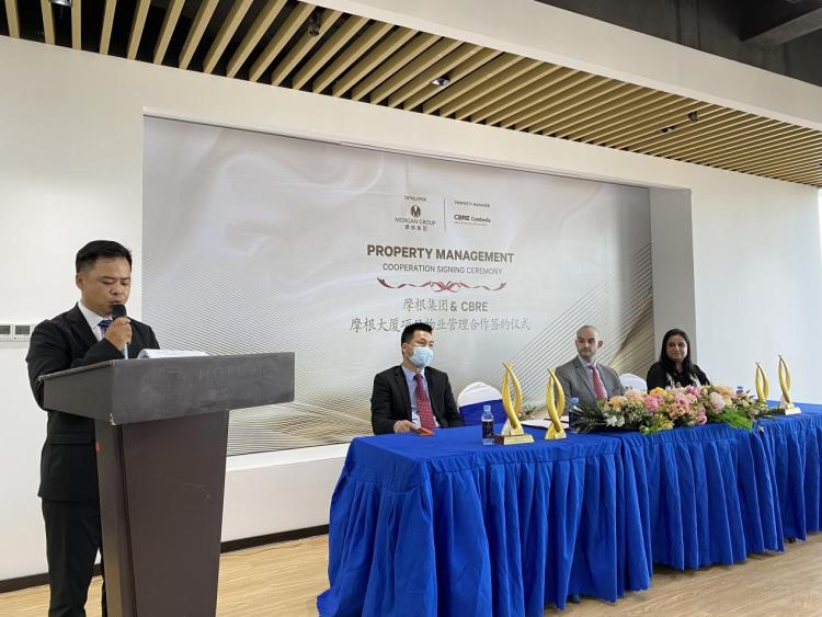 在双方领导和全体嘉宾的见证下,摩根集团副总裁褚泽旭,CBRE世邦魏理仕柬埔寨执行董事Lawrence Lennon代表双方进行了签约。
