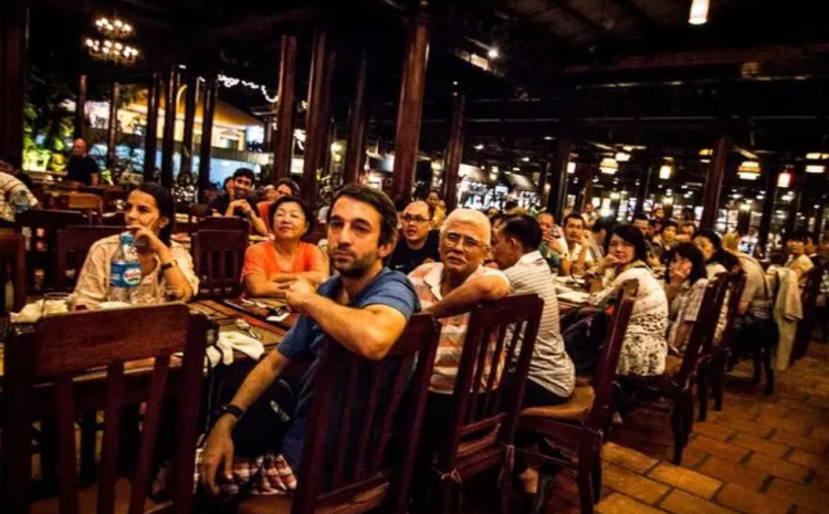晚餐时间到了,旅行团的大巴车一辆接一辆地停在酒楼的门口,车上鱼贯而下客人不到一个小时就把整个酒楼坐满了,三层餐厅、十几间包房都挤满了等待吃饭的客人,酒楼上上下下,忙的不亦乐乎。
