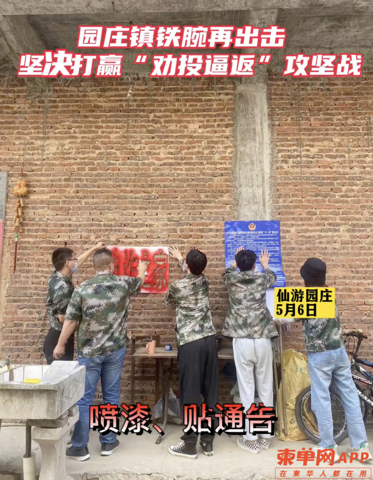 仙游县园庄镇官方微信公号发布的一则宣传视频中介绍,为尽快扭转B类重点涉诈人员回国进度偏慢的被动局面,园庄镇5月6日上午再次组织分管领导、包村领导、派出所所长等,对多个村庄7户8个B类重点涉诈人员采取断水断电、喷漆、贴公告等“十个一律”措施,形成了强大的逼投劝返声势。