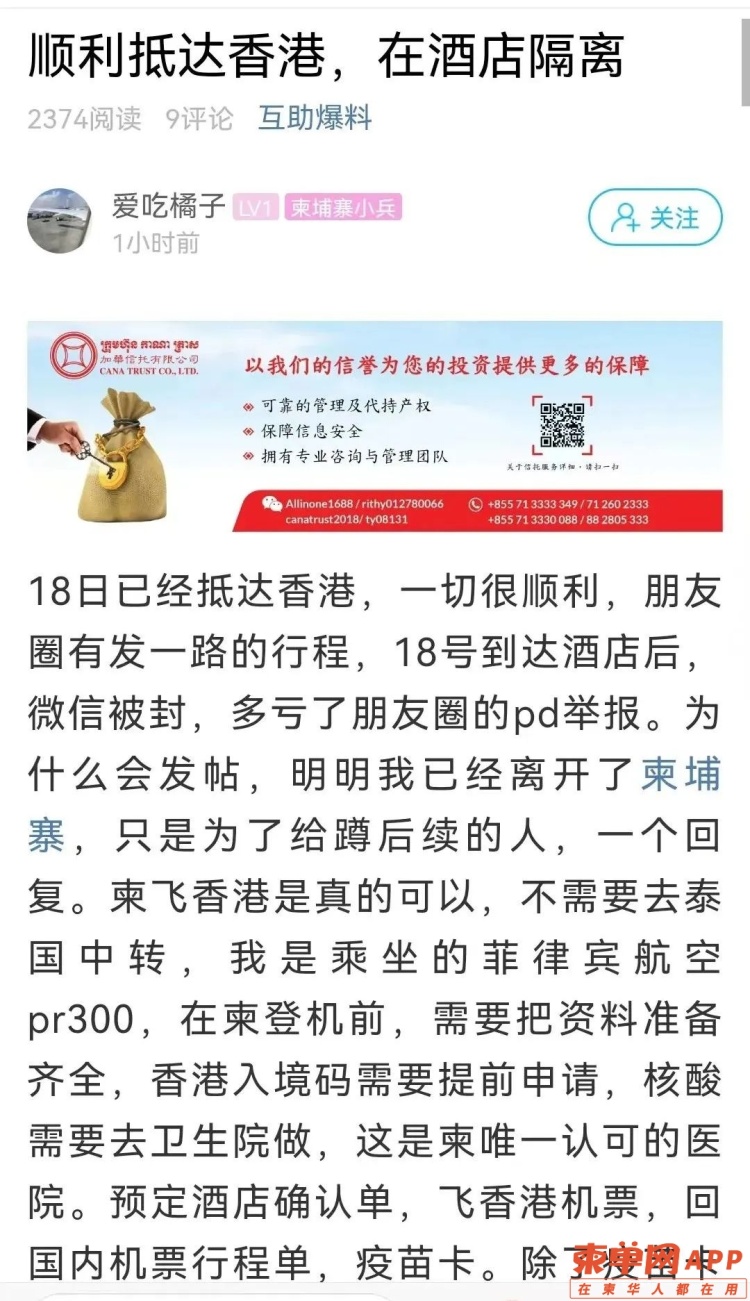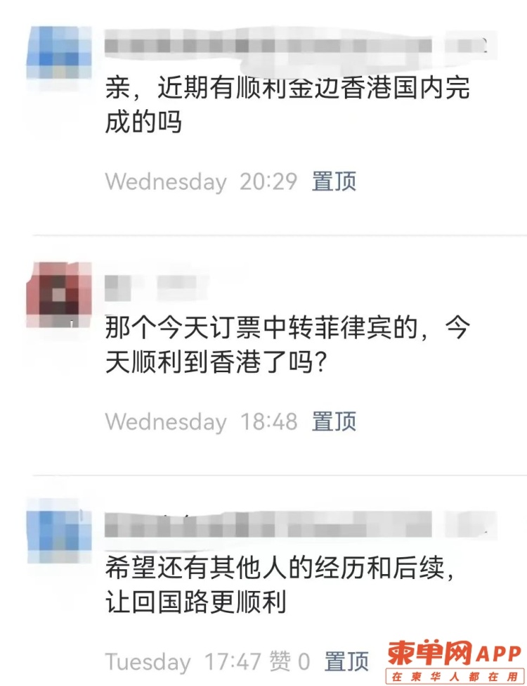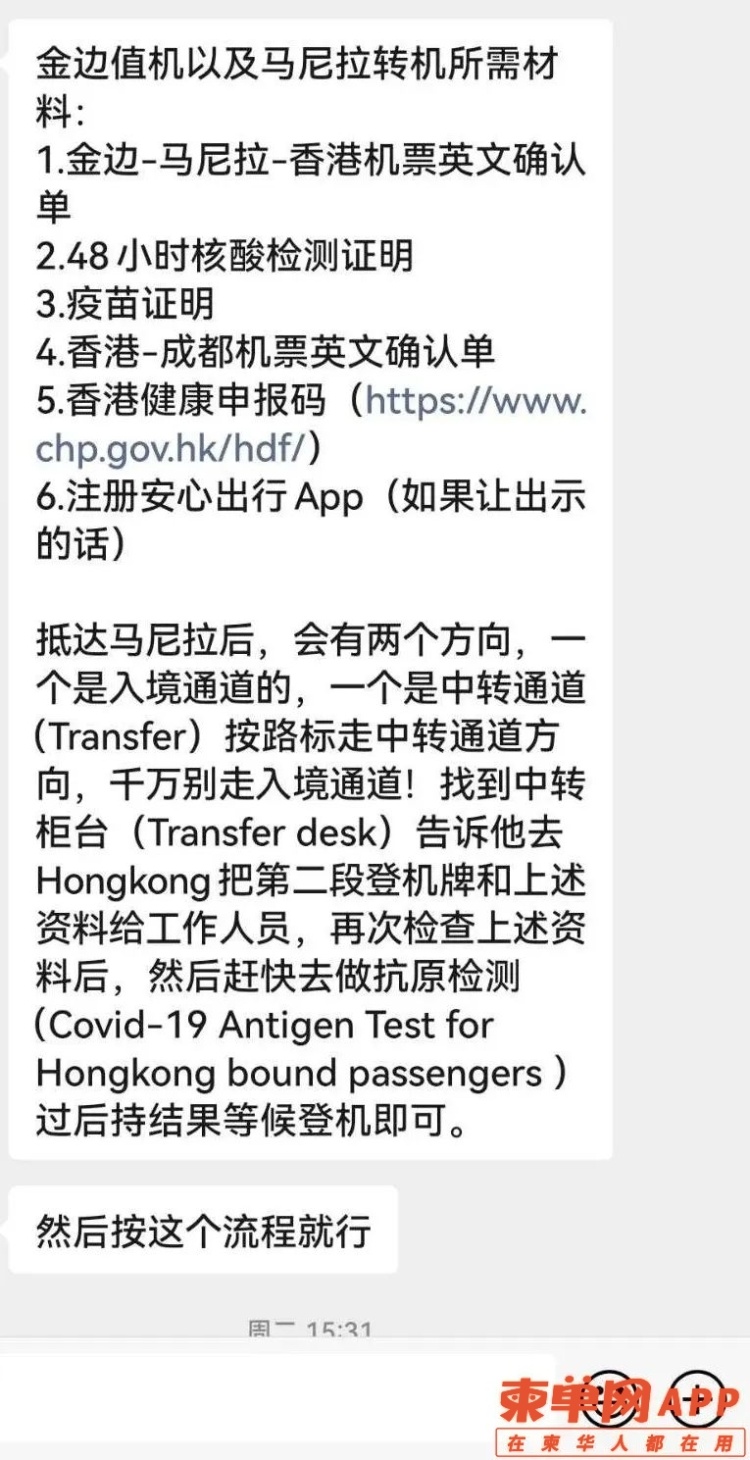 我在金边滞留2个半月,这个月18号我终于回到了祖国的香港。在柬埔寨看到同胞们为了一张机票太不容易了,有些人是买不起,有些是买了很多次却全被取消,太多无奈了。我自己也是抢了两次没抢到,于是果断选择走了香港。目前看来,这条线的确是可行的,但不知道还能走多久。我的运气很好,一次就成功了。18号凌晨12点55飞机,从金边飞往菲律宾马尼拉中转,资料齐全的话,在金边还是通过的很快的,我5分钟通过了。到了马尼拉后还需要做一个快检,并且还会检查一次柬埔寨出境的资料,也是很快的。而后,到了香港需要三个小时办理入境,也需要检测一次。菲律宾航空提供矿泉水饮料和食品,还是不错的,但到了香港机场就像过迷宫一样,一会上楼下楼,一会又坐地铁去拿行李,还要去做核酸快检。到了香港心里舒服多了,在金边机场,我还帮助了两位资料有问题的同胞,最后他们也顺利登机了。飞香港只需要做一次核酸检测,不需要大使馆绿码。香港隔离需要提前预订酒店,住宿方面500多到几万的房间都有,可到香港隔离酒店网站上选择,基本都是商务酒店还不错。同机的同胞有预订的是1500港币的,有预订的是2200港币的,我订的还算便宜才890港币一天。隔离酒店的餐食比较偏广味和西化,想吃辣的同胞可以带点老干妈或者豆鼓鱼罐头。餐食份量不是特别多,女生吃的话刚好,男生差点儿。关于转换插头基本酒店都有,打电话到总台有人会送上来的。已经预订好了回大陆机票的同胞,尽量在机场附近订酒店,这样做的时候做核酸也方便。现在只有到成都国泰航空、香港航空可以在机场做,提前5到8小时就可以了(后续估计其他城市也会陆续开放)。在酒店内都是自测试剂盒,每天一次,第五天香港卫生署来测,需要填写两个自测表格。『同胞经历分享三』柬单网网友@爱吃橘子也成功抵达香港,目前正在香港隔离酒店进行隔离。 下面是该网友在柬单网APP分享的个人经历:18日已经抵达香港,一切很顺利。后来我在朋友圈里发了一路的行程,18号到达酒店后,微信却被封了,这得多亏了朋友圈的票代举报。我已经离开了柬埔寨,发帖的目的也只是为了给蹲后续的人,一个回复罢了。