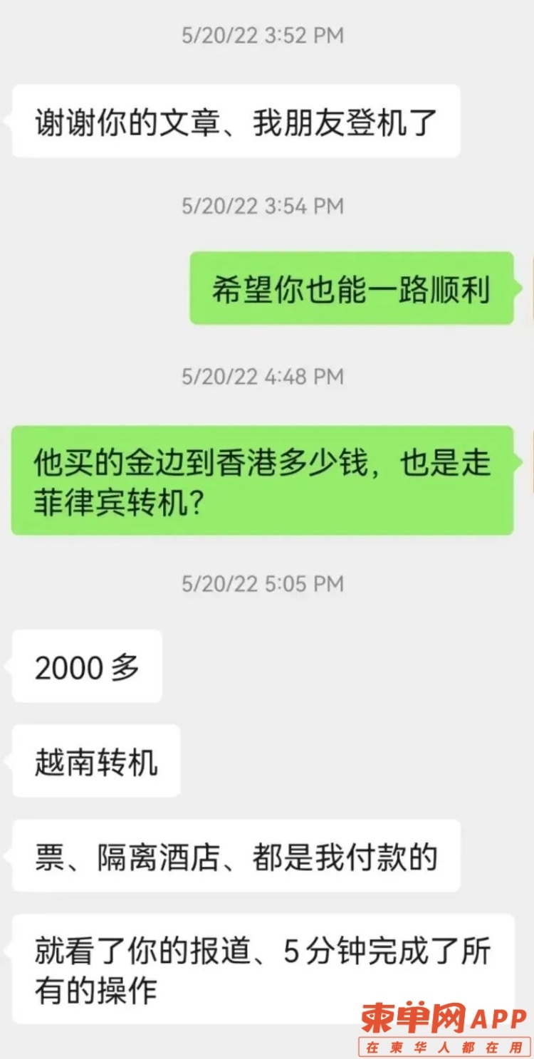 因此小编特地整理了近期一些同胞中转香港的后续。『同胞经历分享一』5月20日,柬单网记者收到了一名同胞的“感谢消息”。该同胞表示,自己的朋友看了柬单网关于“中转香港回内地”的文章后,立即按照文章中的方式进行了操作。5月20日,这名同胞的朋友顺利在金边登机,从越南中转而后成功入境香港。并且这名同胞称,朋友购买的金边至香港的机票仅2000多人民币,香港至上海的机票也不到3000人民币,并且朋友还成功预订到了香港的一家非常便宜的隔离酒店。总体算下来,花费仅仅一万多人民币(除开内地隔离外)。