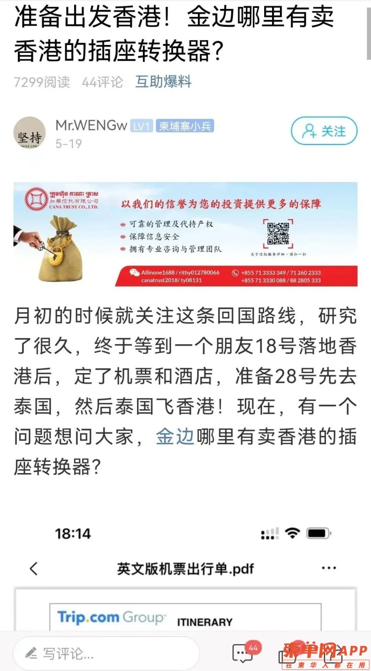 除了上述已经入境中国香港的同胞,还有不少同胞已经预订了机票和酒店,不久后将离开柬埔寨。比如,下面这名网友@Mr.wengw在柬单网上询问相关事宜,他将先去曼谷,然后再飞往香港。