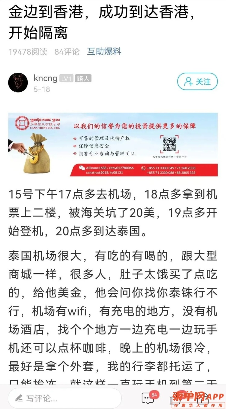 柬单网网友@Kncng也成功到了香港,目前正在香港隔离酒店进行隔离。 下面是该网友在柬单网APP分享的个人经历: 15号下午17点多去金边机场,18点多拿到机票上机场二楼,被海关坑了20美金,19点多开始登机,20点多到达泰国。泰国机场很大,人很多,有吃的有喝的,跟大型商城一样,肚子太饿买了点吃的,给他美金,他会问你找你泰铢行不行。机场有wifi,有充电的地方,没有机场酒店,找个个地方一边充电一边玩手机还可以点杯咖啡。晚上的机场很冷,最好是拿个外套,我的行李都托运了,只能挨冻,就这样一直玩手机到第二天早上16号。6点30去厕所洗了个脸,买杯热咖啡,等下一班飞香港的飞机。8点开始检票登机,8点30多起飞,中午11点40到达香港。下飞机后去做核酸检测,香港做核酸一点都不难受,这是真的。然后查你来这边干嘛,问了一堆问题,经过了漫长的操作之后,下午14点左右被拉去隔离酒店,开始隔离。在酒店会发给你核酸快速检测包,每天要做,还要记录,还有一点,香港的酒店充电插座是方头的,酒店也没有转换器,手机都快没电了,然后找香港朋友送到酒店的,酒店可以点外卖,但是会很慢,而且贵。 ![]()
