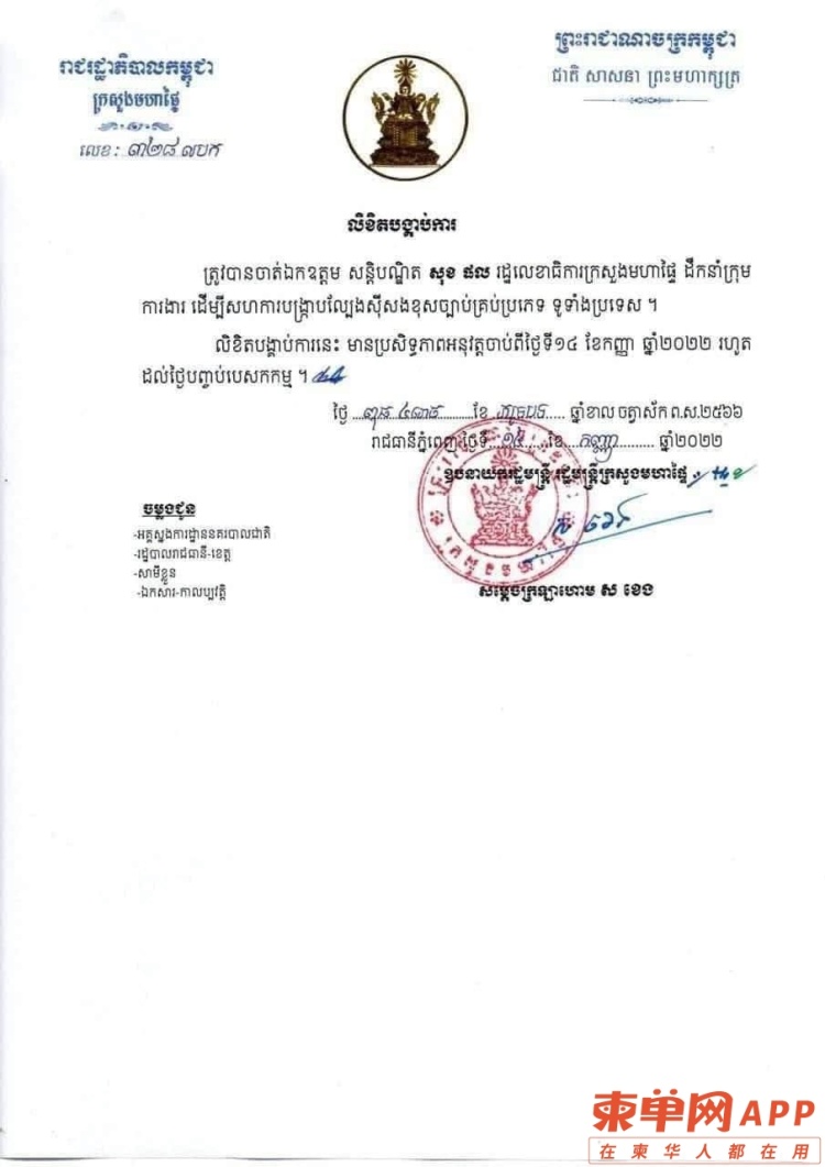 柬单网综合报道】据柬媒消息,9月14日,副总理兼内政部长苏庆签发命令,即日起,要求内政部秘书长Sok Phal带领警队严打全国境内一切形式的非法赌博。