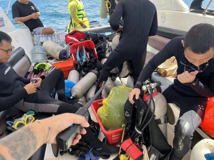 在海面搜寻后的第二天,潜水队也开启水下搜寻工作。沉船所在的海域深度,大概在海平面以下 28 米左右,队长阿童的潜水电脑表显示,沉船深度在 28.3-28.8 米左右。当船只沉没时,船内有大量空间,周围的水会迅速涌入船体挤出船内的空气,由此形成旋涡。当旋涡形成时,在船只周围的落水者也极有可能被吸入其中。水性不好的人,很难逃脱这种桎梏。但与此同时,也存在一种可能,即船舱内部分空间未被完全淹没,如果有幸存者恰巧在此,那极有可能生存下来。为了找到沉船的真正位置,阿童教练带着队员不断下潜。一共有8名潜水员,有两名队员安排在海面救援,剩余6人安排在水下搜寻。(由受访者供图)