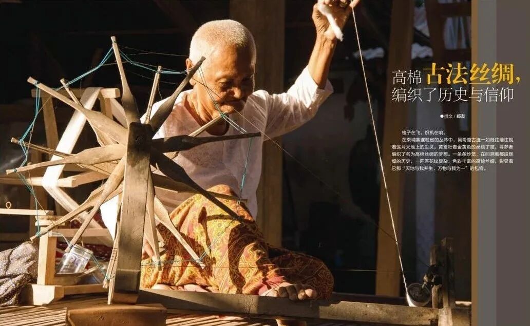 梭子在飞,织机在响. 高棉古法丝织工艺是柬埔寨传统工艺之一. 目前已知最早记载柬埔寨的丝绸的文献是中国元朝时期周达观所著《真腊风土记》.其中提到:"近年暹人来居,却以蚕桑为业,桑种蚕种皆自暹中来.”