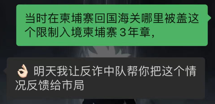 随着国内反诈政策的加强,大批海外工作者被大数据一手“掌控”,尤其是身处柬埔寨的中国同胞,大部分人都遇到过报备、黑名单、回国调查、限制出境等。 近日,涛先生在柬单网爆料称,自己被国内大数据拉黑,遣返回国时,被柬埔寨海关盖了章——限制入境柬埔寨3年,下了飞机还被异地警方带走问话。 记者:时宜