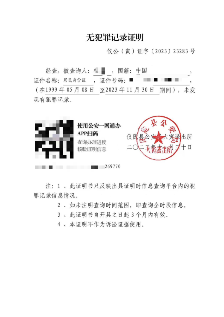 而杨先生顺利通过4个不同的审批程序和关卡。7月31日,杨先生回金边被拦截并且关了一晚。8月1日,他从金边出发广州,回去后又继续配合重庆警方调查。据杨先生透露,警方说他微信里有可疑人员。“其实,重庆警方在送我回去的路上已经告诉我,他是可以出境的,但要随时接受警方的询问。”杨先生向记者说。不仅如此,记者也查看了警方给杨先生开具的无犯罪记录证明,证明上写到:在1999年05月08日至2023年11月30日期间,未发现有犯罪记录。 ![]()