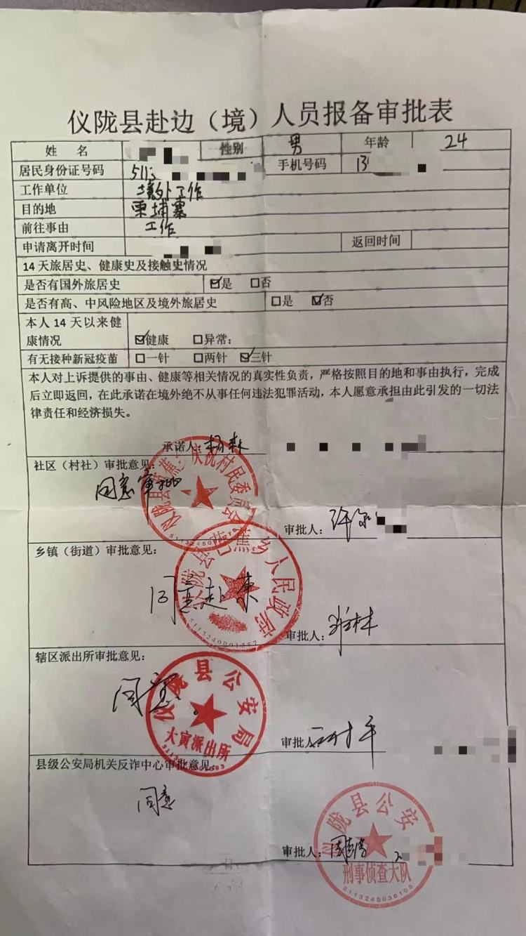 中国人上移民局黑名单有哪些标准?又该如何解除黑名单?柬单网记者致电移民局热线,对方不予置评。据杨先生介绍,他来自四川仪陇,2019年就来到了柬埔寨,当时在夜场工作,后来攒了些钱与朋友合开了一家旅行社办理签证及机票业务。直至今年4月,杨先生在柬埔寨长时间未回去,当地警察要求他回国接受调查。回国后,他也很快拿到了当地“赴边(境) 人员报备审批表”。柬单网记者查看了“赴边(境) 人员报备”的文件,发现该报备审批表都有严格的审批流程:社区(村社)审批、乡镇(街道)审批、辖区派出所审批、县级公安局机关反诈中心审批。 ![]()