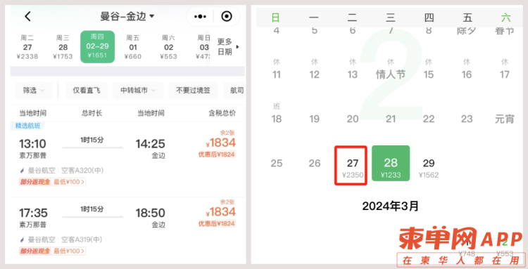 记者随后查询机票和酒店,发现微信同程旅行上近日曼谷到金边的机票涨价到1500元到2400元人民币左右,远超平日价格。
