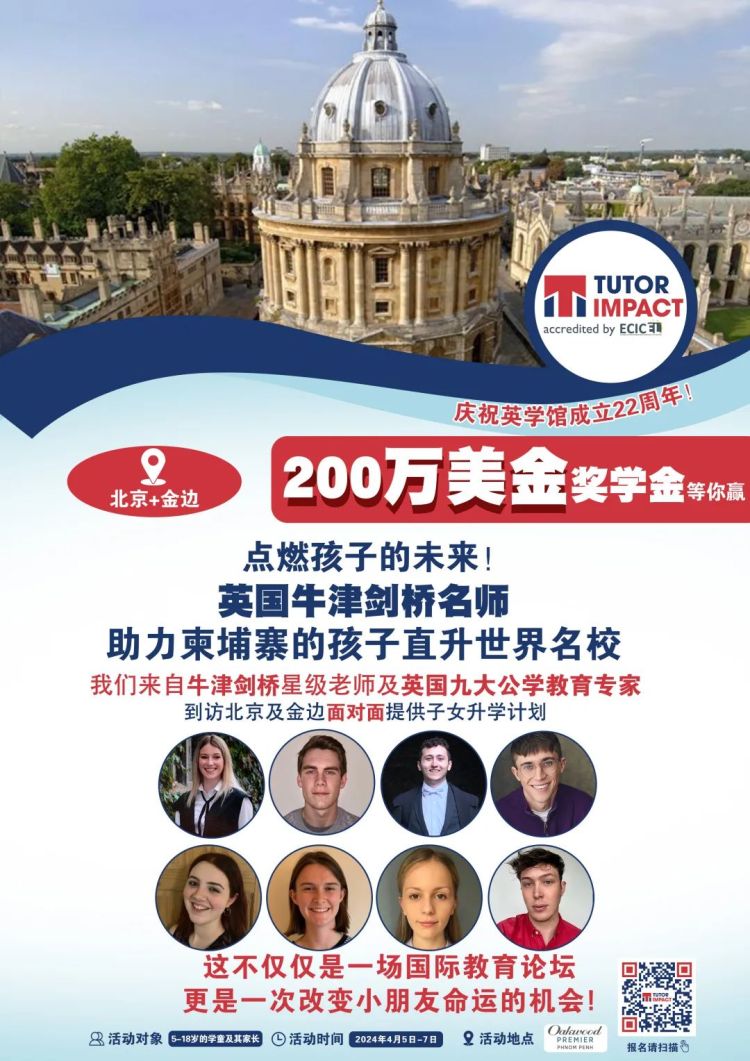 为了庆祝 Tutor Impact 英学馆成立 22 周年,此次跨国活动特别为北京和金边两地的 5-18岁的优秀学童设立总额超 200 万美金的奖学金,机会难得,不要错过!