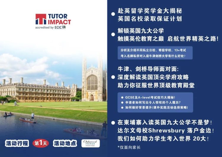 本次活动,牛津剑桥大学的导师们将到达金边,与您面对面交流,为您深度解析英式教育之精髓,并以“过来人”身份分享如何规划孩子的教育升学路径。除此之外,名师专家们还将带领孩子们体验不同主题的工作坊,以探索未来职业方向,并学习如何为入读心仪的名校做好各方面的准备。”