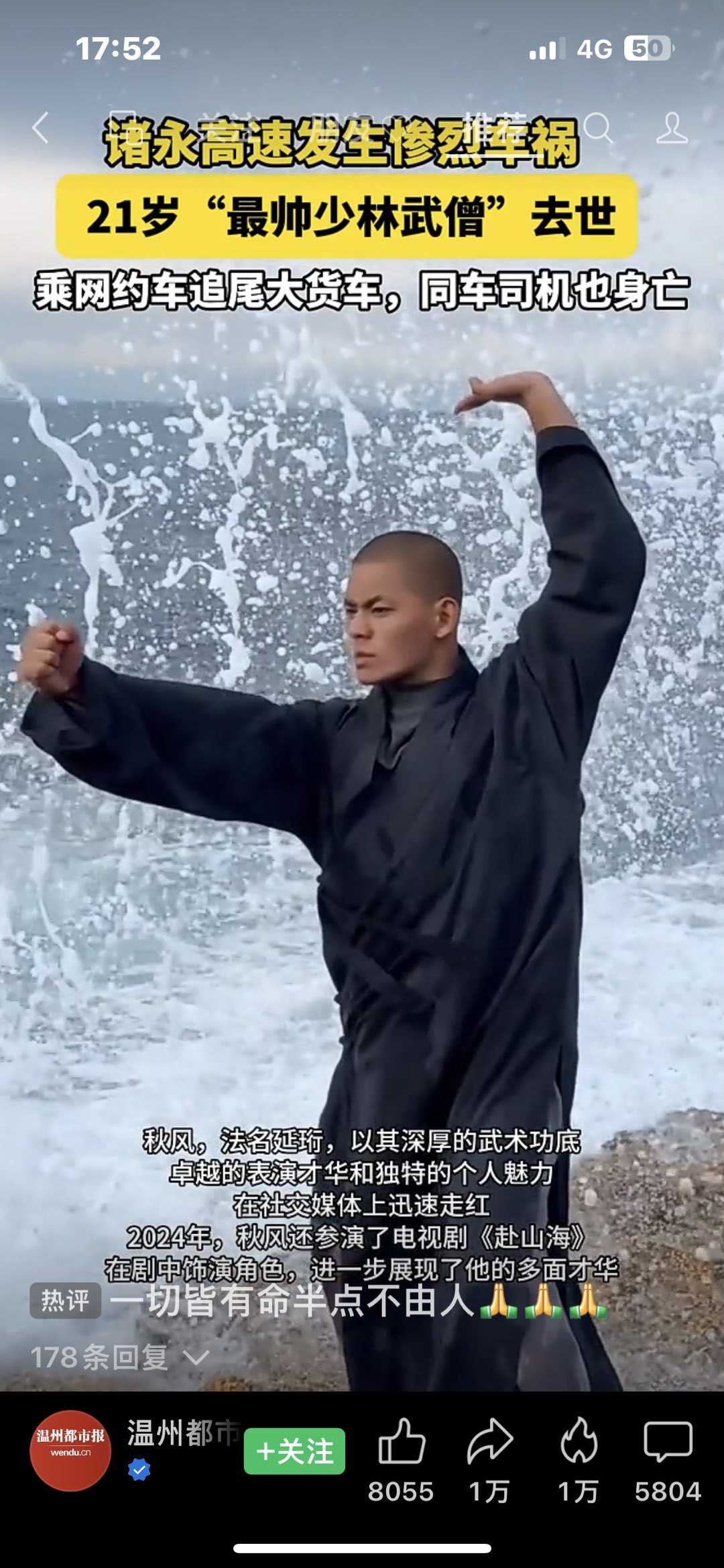 8月9日,据知情人士从少林寺僧人朋友圈得知,8月7日凌晨0时53分许,秋风所乘网约车辆,于浙江诸永高速温州方向,不幸发生追尾事故。