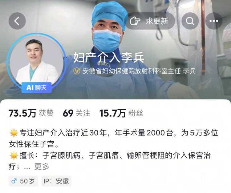 (李兵医生抖音主页) 此外,他在抖音平台累计粉丝超15万,众多患者慕名寻医,形成一股“只找李主任做介入手术”的口碑潮。在云图国际医院,李兵的到来不仅提升了妇科治疗的专业高度,也将这家原本以生殖科见长的医院推向了多科室融合发展的新阶段。急救中心、骨伤科、外科、内科、中医科、妇产科、生殖科、不孕不育、肛肠科、碎石科、影像科、微创中心……组成了一套从诊断到治疗、从手术到康复的完整医疗链条。 ![]()