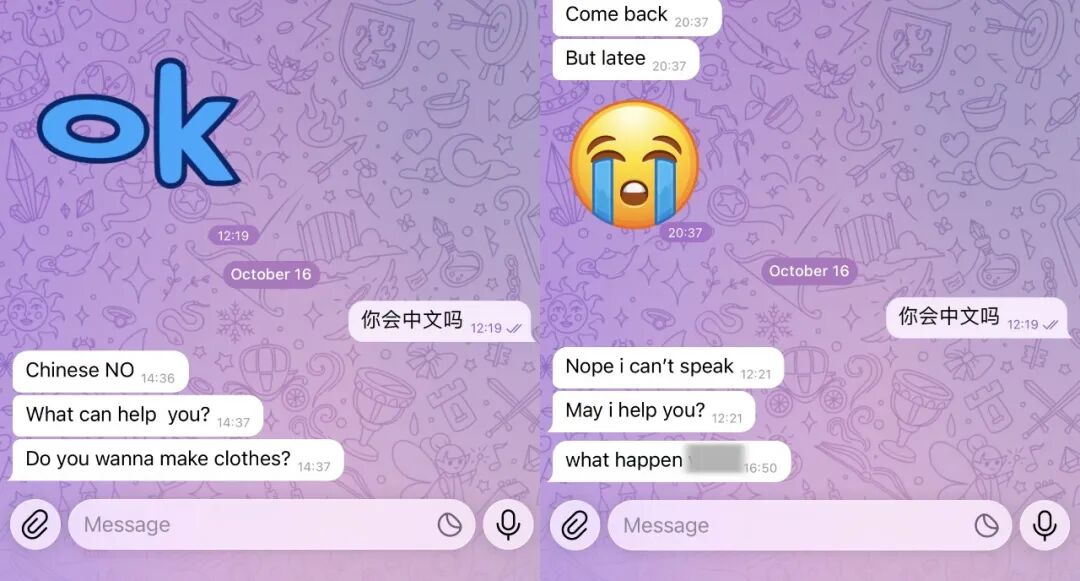由于小羊账户有不少英文客户及好友,骗子逮到就问“会中文吗?”、“把你们老板联系方式发过来。”……如若对方不按套路回答,骗子便立马翻脸,行为张狂,态度恶劣。