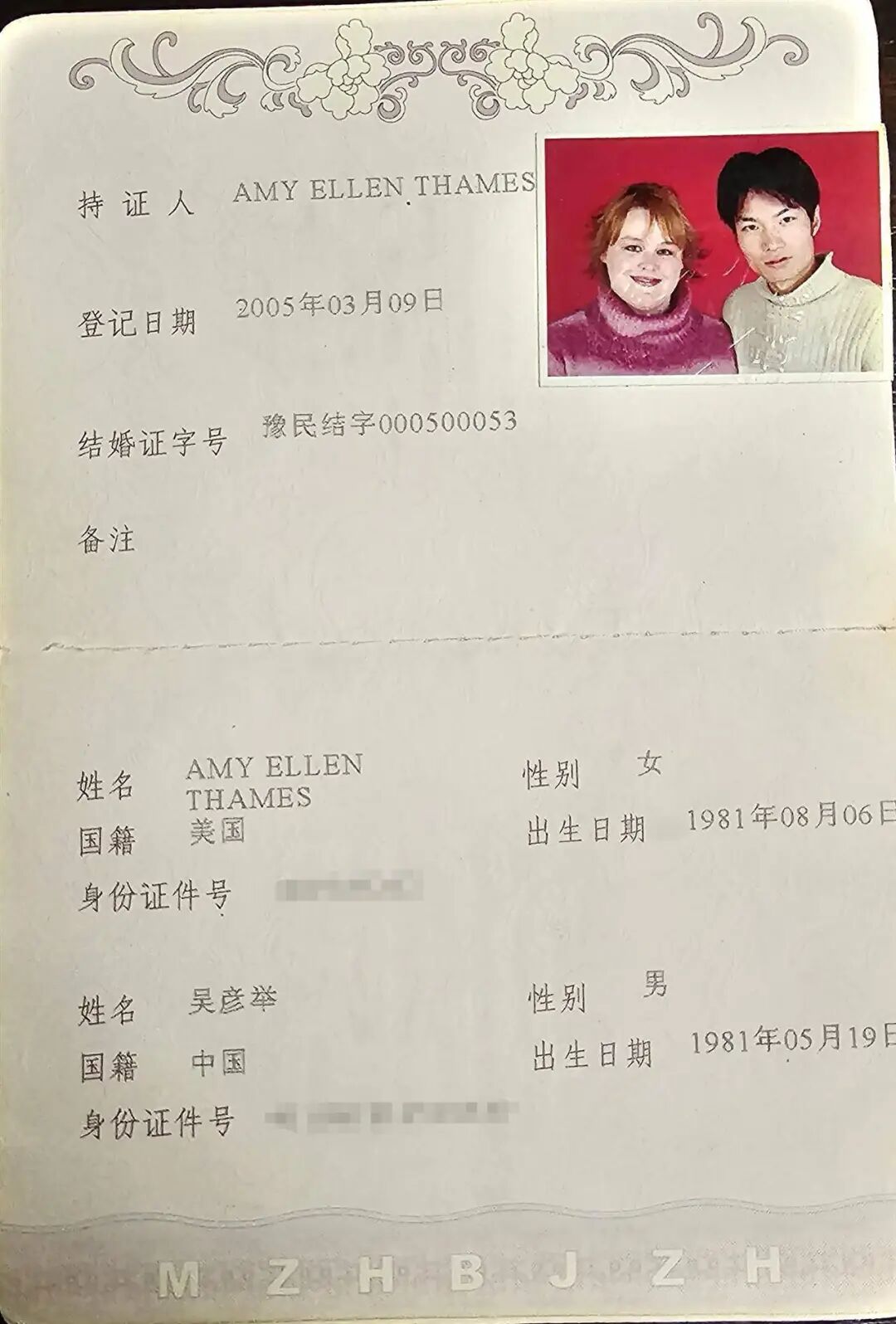 10月26日,极目新闻记者联系上当事人吴彦举,他说他是河南省禹州市农村人,是在新疆的按摩店打工时认识的美国妻子Amy Thames (下称中文名:吴爱美),2005年结婚时妻子刚大学本科毕业,目前是一所国际学校的幼教老师,博士论文已通过答辩,他们还有一对可爱优秀的女儿。