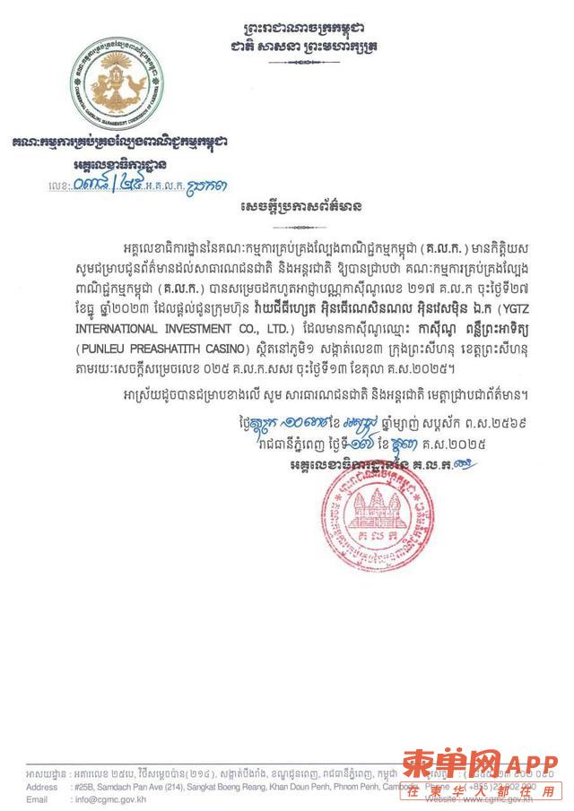 【柬单网综合报道】据柬媒消息,柬埔寨商业博彩管理委员会秘书处近日发布公告,正式撤销YGTZ国际投资有限公司所持有的赌场营业执照。该公司旗下的赌场——“阳光娱乐城”,位于西港第3分区第1村。