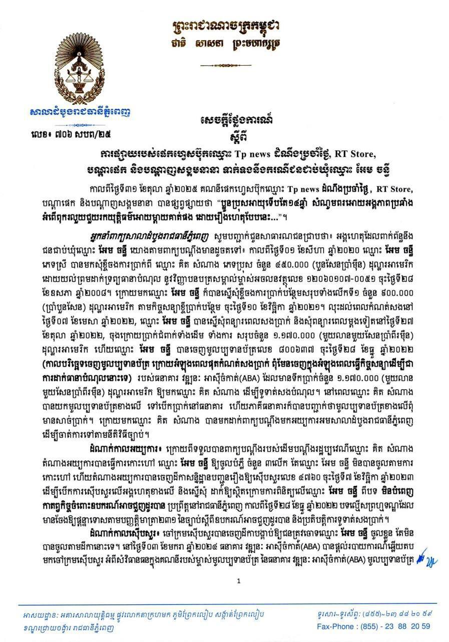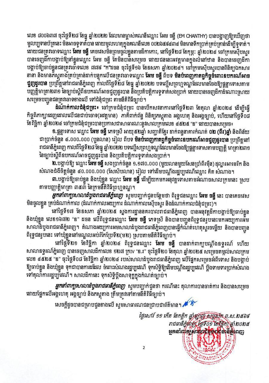 法院在声明中回顾,本案源于2020年8月,涉案女子Em Chanthy向他人借款45万美元,并以名下土地和房屋产权证作为抵押。因其后续未能偿还债务,并开出了空头支票,债权人遂向检察机关提出控告,本金连同利息及相关费用共计约117万美元。