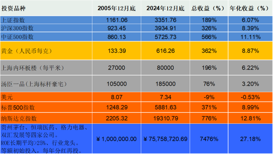 既然是长期的投资理财计划,那么就以长期的维度来看一下,哪些资产类别可以为我们带来相对比较高的收益,来为我们的投资理财实现“滚雪球”效应吧。请看以下这张我每年都更新的、大家都可及的投资品的长期收益比较表: