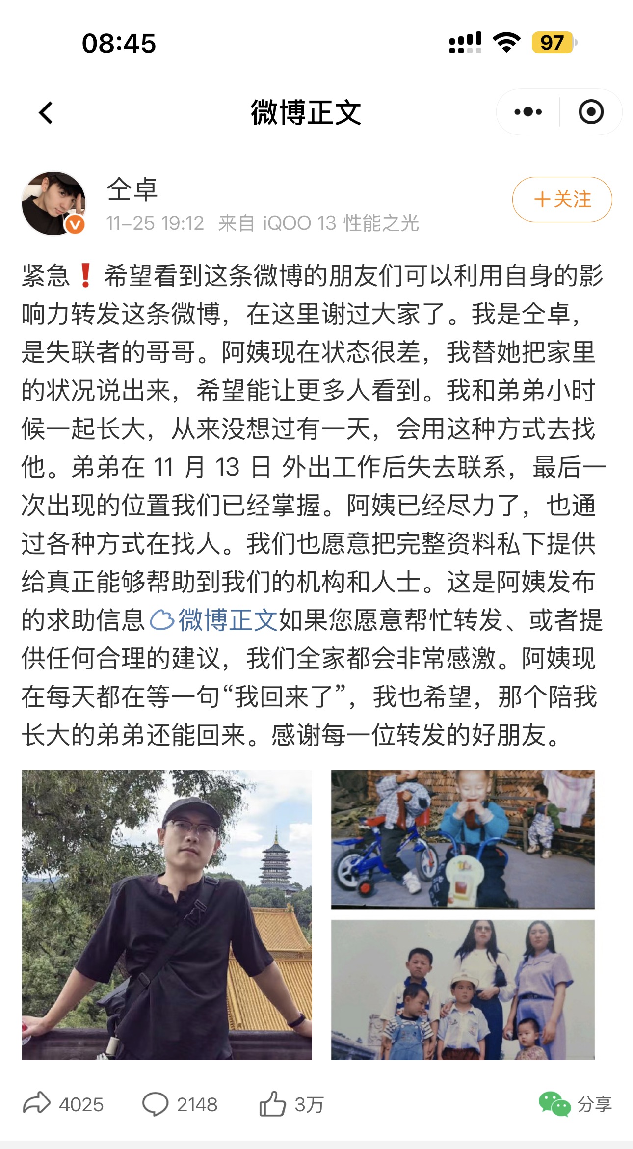 仝卓在求助文中表示,他与弟弟从小一起长大,家人正通过各种渠道寻找,并愿意将完整资料提供给能够协助的机构或人士。他称,失联者母亲“状态非常差”,全家人只能寄望于更多人的关注和帮助。