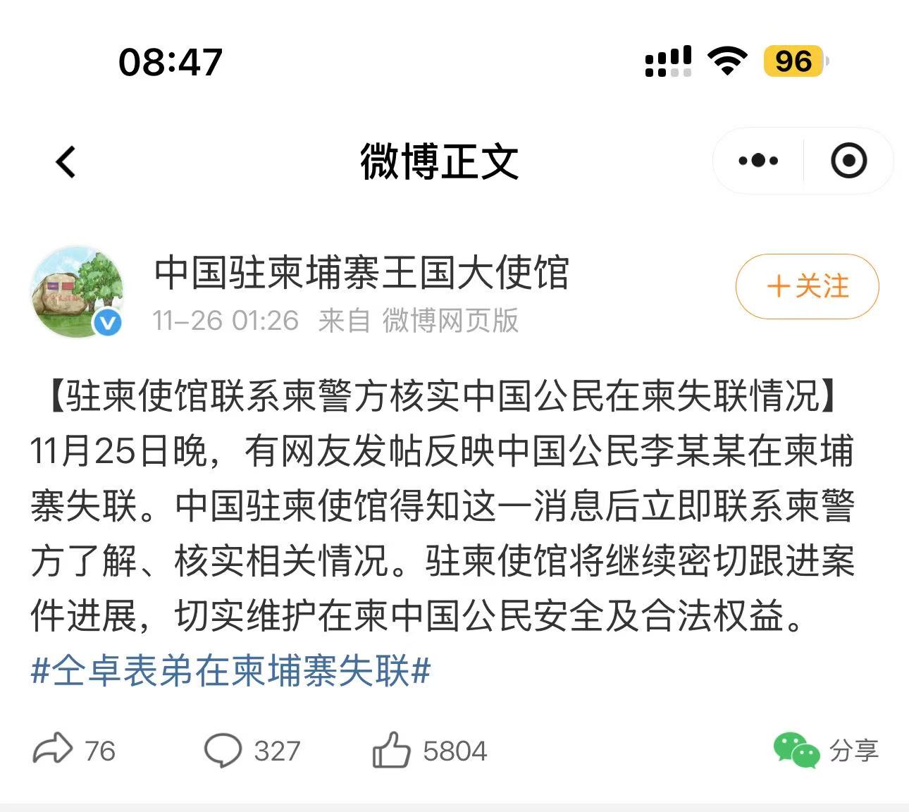 11月26日凌晨,中国驻柬埔寨大使馆发布通告回应称:11月25日晚,有网友反映中国公民李某某在柬埔寨失联。使馆在获悉有关情况后第一时间与柬埔寨警方联系,了解并核实相关信息,并表示将继续密切跟进案件进展,切实维护中国公民在柬安全及合法权益。