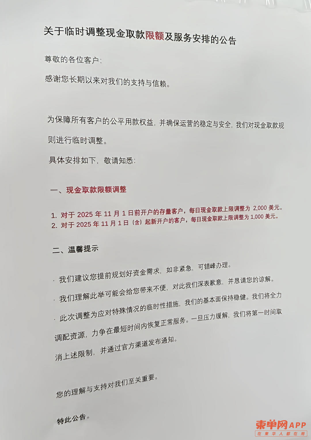 据多名到场用户反映,近期前往汇旺线下网点办理取现的人数明显增多,限制额度使得排队情况愈发突出。一名用户表示:“工作人员告诉我们,2025年11月1日前开户的客户,每日现金取款限额2000美元;2025年11月1日(含)起新开的客户,每日现金取款限额1000美元。如果需要用钱,让我们多等几天再来取,并保证一定可以取到钱。”
