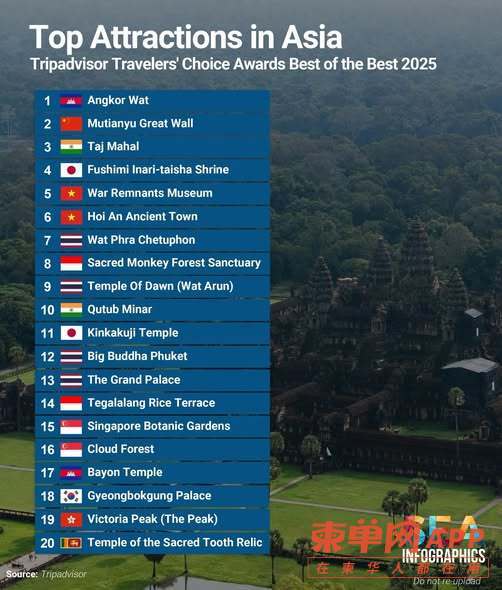 【柬单网综合报道】据柬媒消息,Tripadvisor日前公布2025年“旅行者之选大奖”榜单,柬埔寨吴哥窟再度登顶“亚洲最具吸引力旅游目的地”榜首,巩固其在全球文化旅游版图中的领先地位。