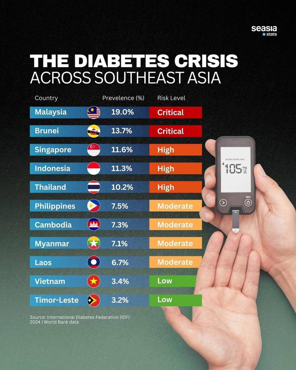 数据显示,马来西亚以19%的糖尿病发病率位居东南亚首位,被划为高风险国家,其次为文莱,发病率达13.7%。专家指出,现代生活方式转变、不健康饮食结构以及预防措施不足,是推动该地区糖尿病高发的主要因素。