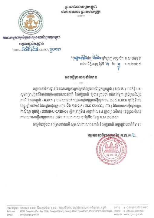 编译:Yin校对:小米【柬单网综合报道】据柬媒消息,12月2日,柬埔寨商业博彩管理委员会宣布,位于西港第4分区4村的东湖赌场因违规经营被吊销营业执照。