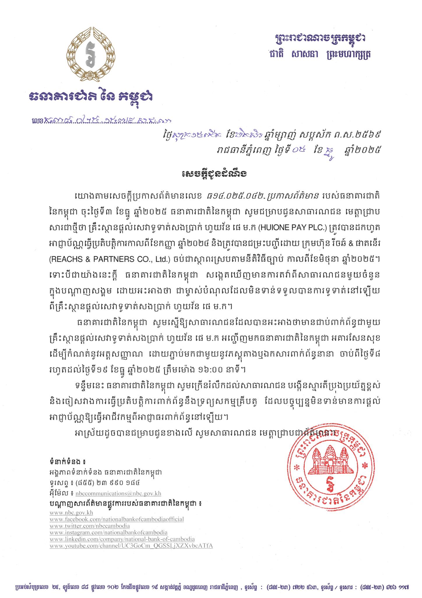 【柬单网综合报道】柬埔寨国家银行(NBC)于12月5日发布通告,呼吁尚未从汇旺支付获得清偿的债权人,于2025年12月8日至19日16:00前,携带相关证据材料前往国家银行森速总部登记身份。