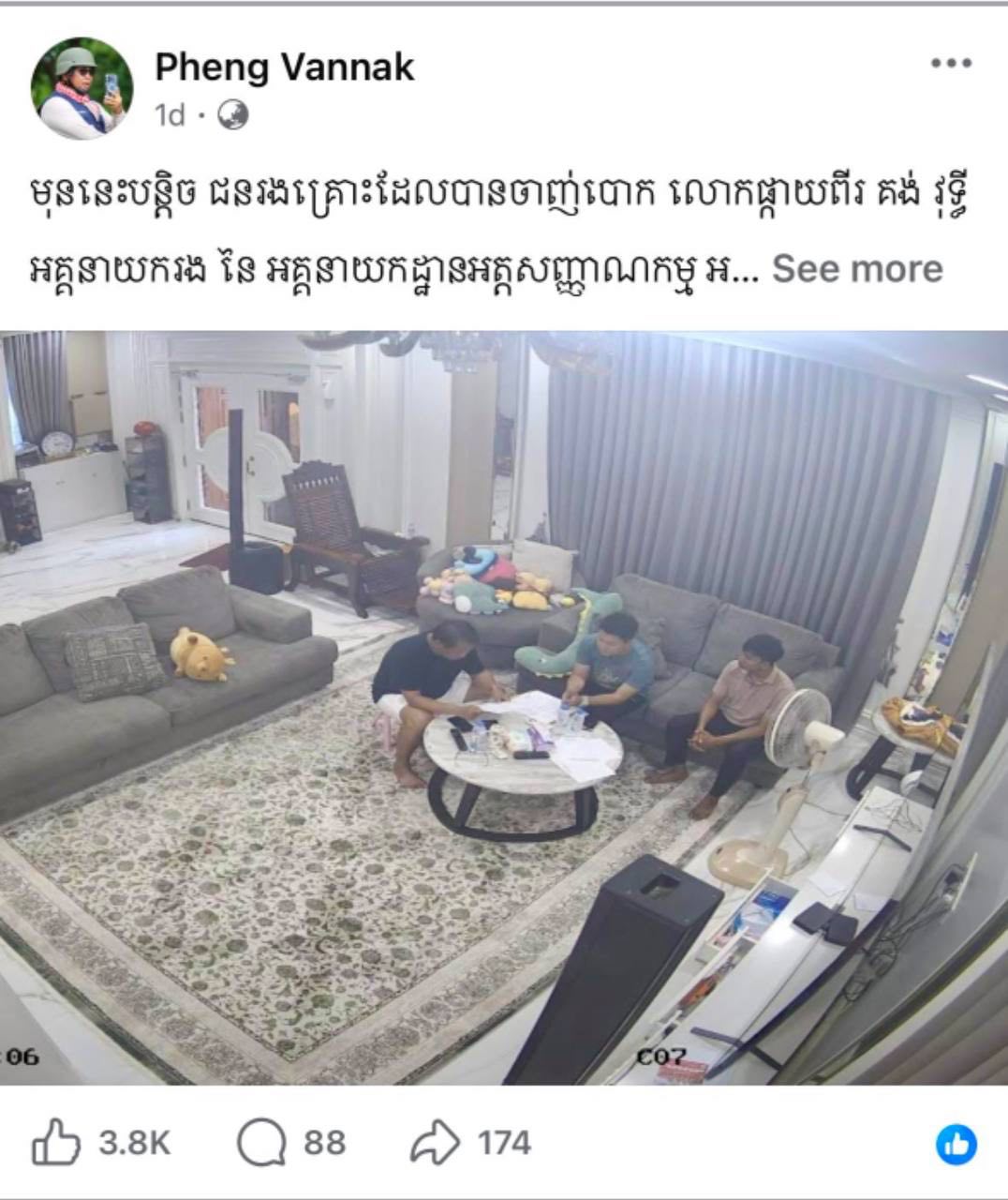 对于照片中桌面上的大量现金,他解释是其妻子经营的珠宝店"Pisey Diamond"的客户付款,他仅协助点算并将资金送往银行。