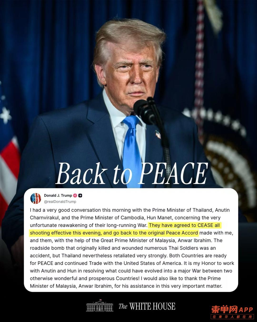 特朗普强调,柬埔寨与泰国已承诺全面停止相互开火行为,并回到此前达成的和平协议与停火框架内,推动边境局势逐步降温。他表示,此次共识是在其今年10月促成停火的基础上,双方再次确认通过和平方式处理分歧的共同立场。