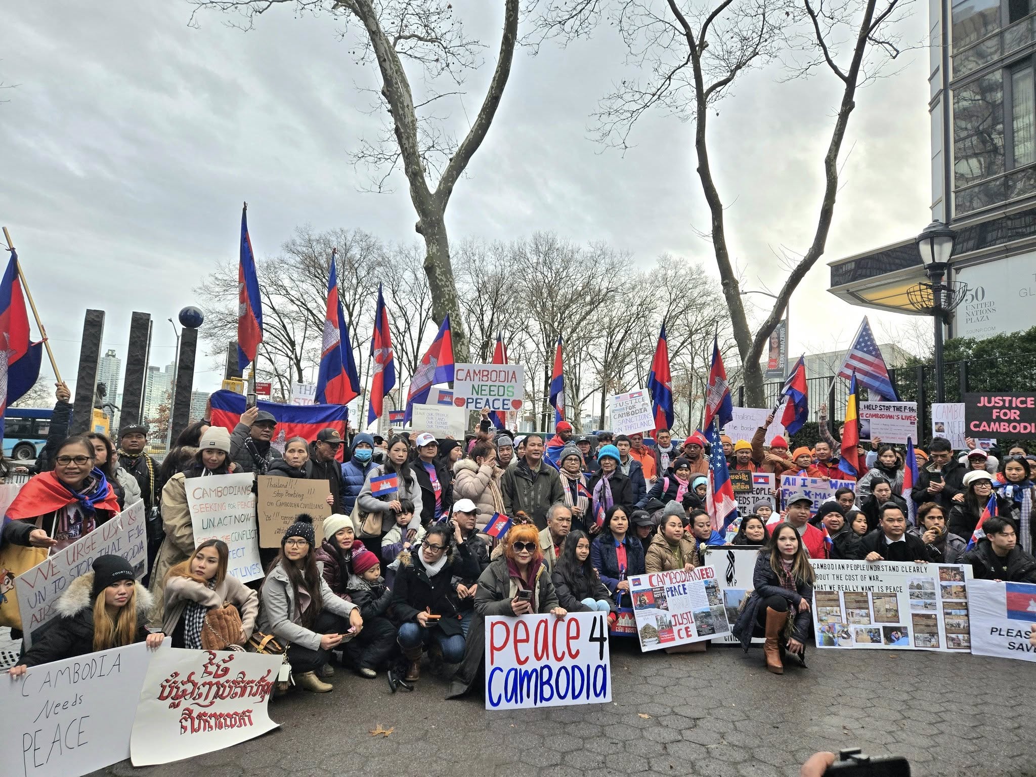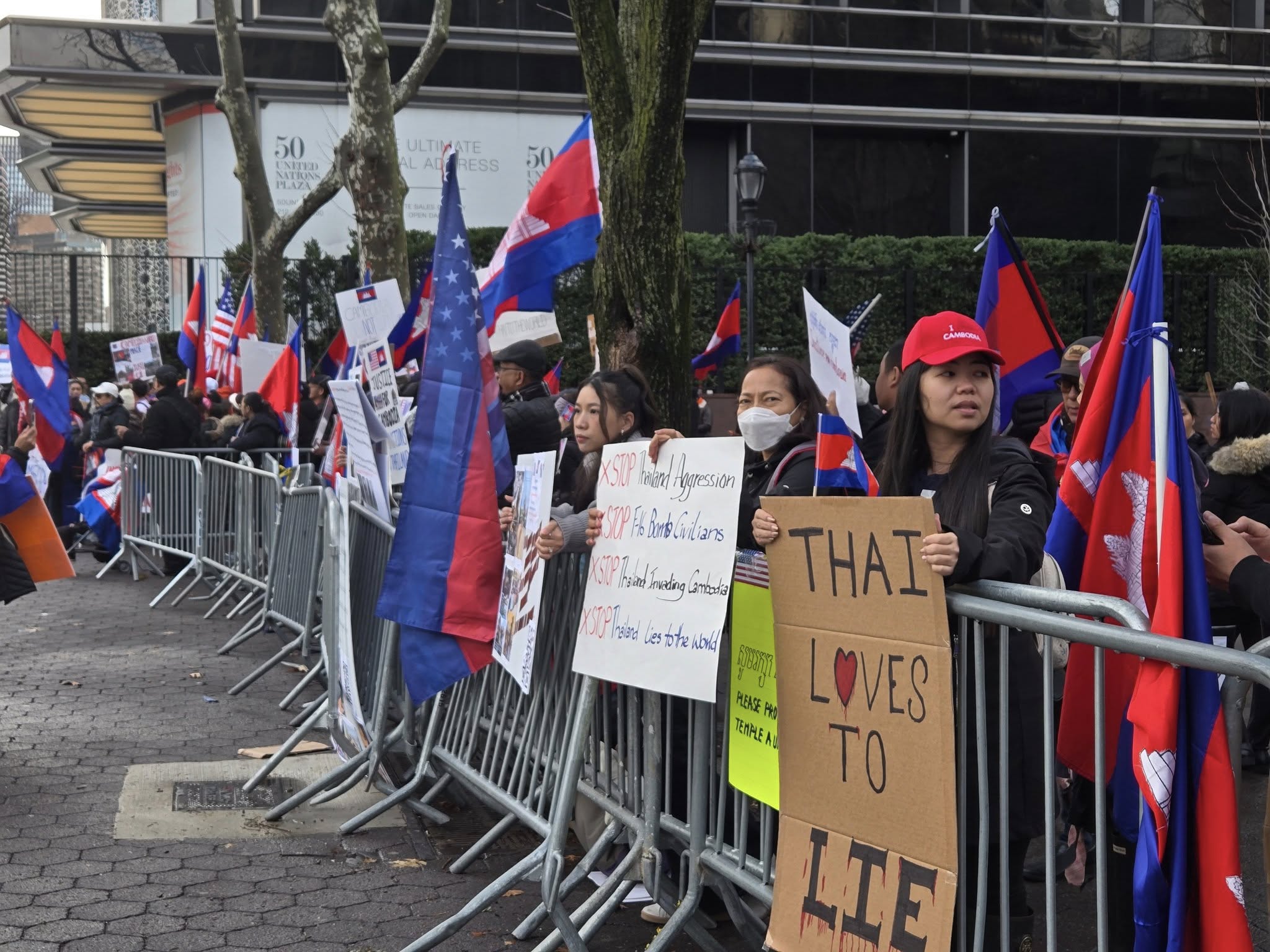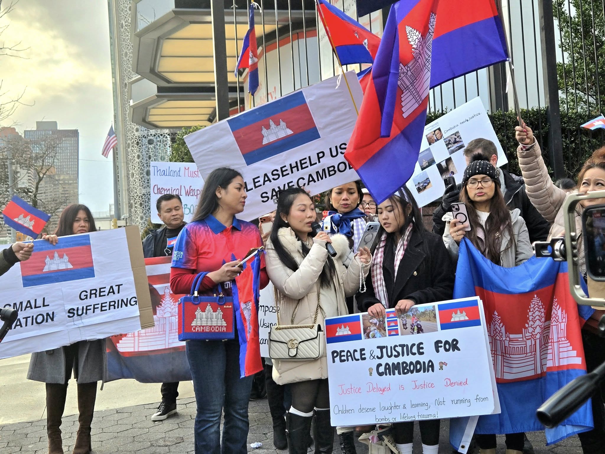 旅美柬埔寨侨民在联合国总部集会,抗议泰军侵犯柬埔寨主权