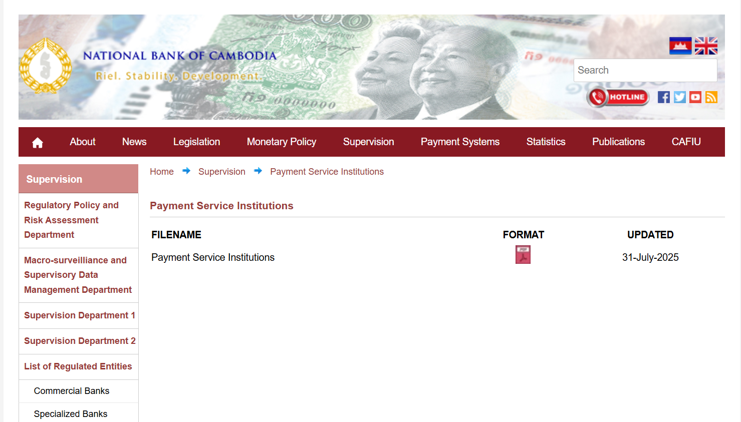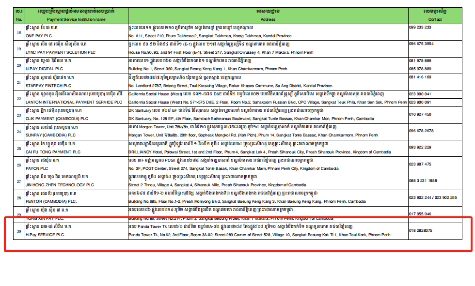柬单网记者发现,柬埔寨国家银行(NBC)于2025年7月31日公布的支付服务机构名单显示,H-Pay Service PLC.名列其中,而且注册地点位于金边熊猫银行,具备在柬合法开展支付服务的资质。