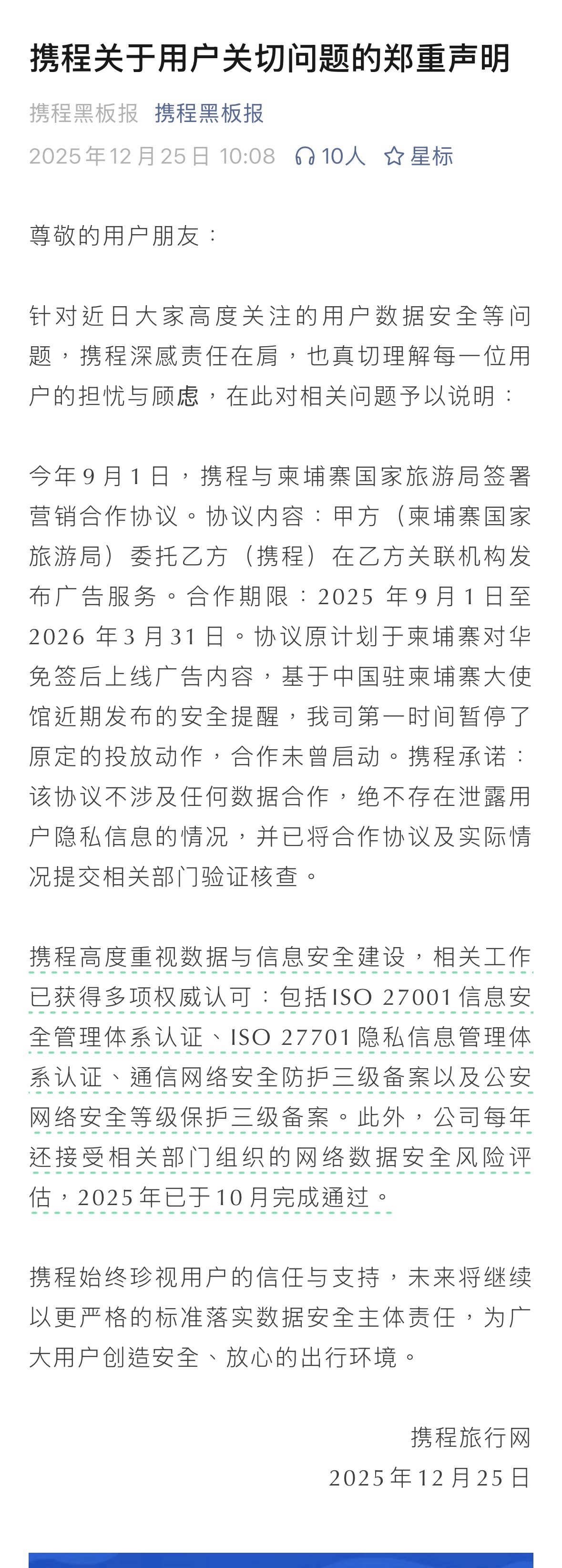 今年9月1日,携程与柬埔寨国家旅游局签署营销合作协议。协议内容:甲方(柬埔寨国家旅游局)委托乙方(携程)在乙方关联机构发布广告服务。合作期限:2025 年9月1日至2026 年3月31日。协议原计划于柬埔寨对华免签后上线广告内容,基于中国驻柬埔寨大使馆近期发布的安全提醒,我司第一时间暂停了原定的投放动作,合作未曾启动。携程承诺:该协议不涉及任何数据合作,绝不存在泄露用户隐私信息的情况,并已将合作协议及实际情况提交相关部门验证核查。