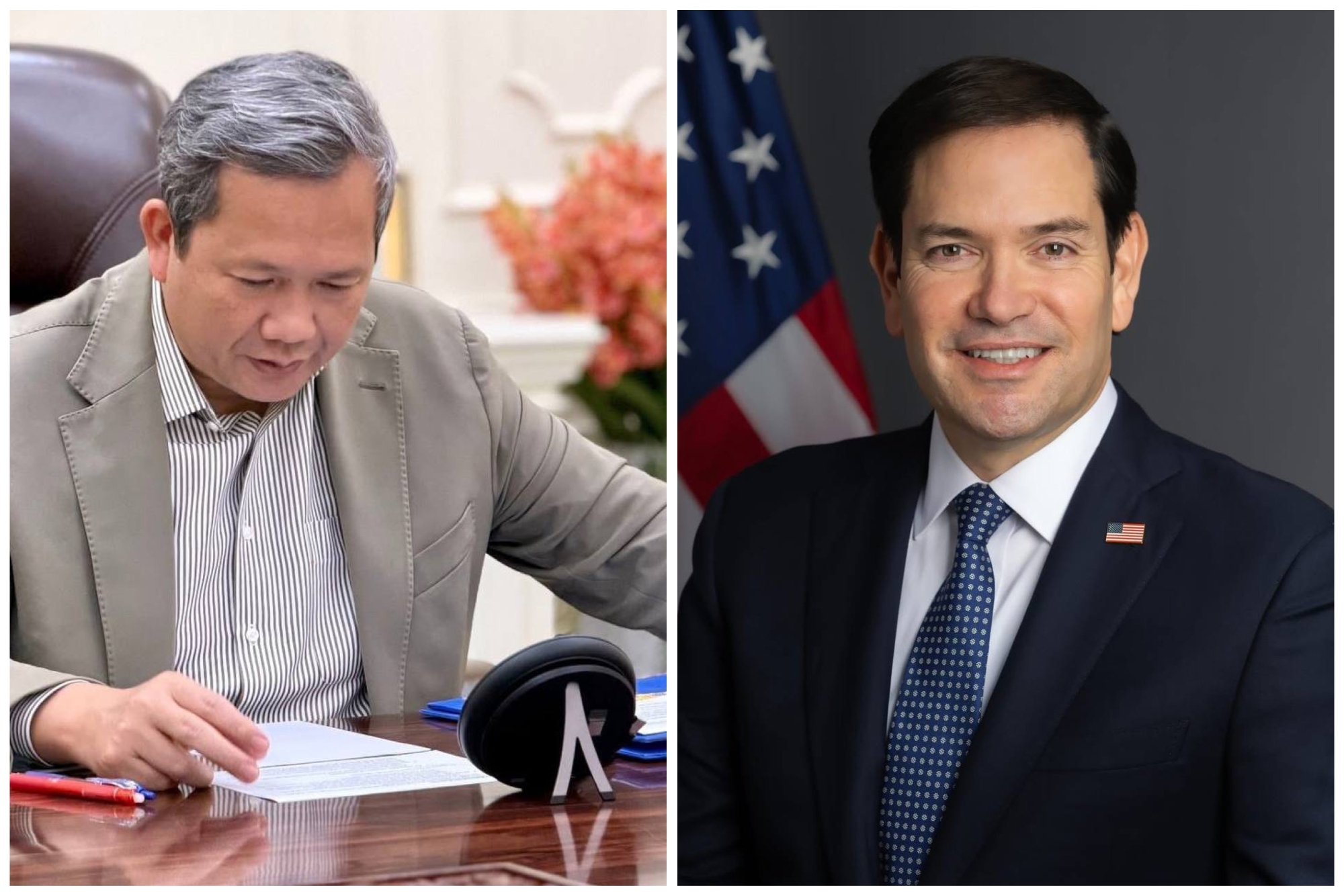 柬单网报道,12月25日晚,洪玛耐首相应约与美国国务卿鲁比奥通电话,双方就柬泰边境局势的最新进展深入交换意见,重点围绕推动尽快实现停火、落实既有和平协议,以及为两国实现持久和平与地区稳定创造条件展开讨论。